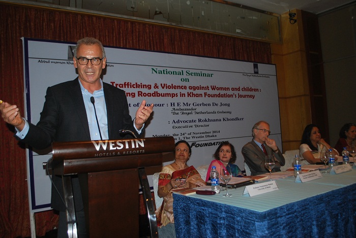 Seminar on Fighting Trafficking & Violence against Women and Children: Overcoming Roadbumps in Khan Foundations Journey![]() Khan Foundation organized a seminar on Fighting Trafficking & Violence against Women and Children: Overcoming Roadbumps in Khan Foundations Journey on Monday the 24th of November, 2014 at 2:30 pm at Ballroom 1, Hotel Westin, Dhaka Ambassador Gerben de Jong, Embassy of the Kingdom of the Netherlands in Bangladesh was present as Guest of Honor and Mr Leo Kenny, Country Director, UNAIDS Bangladesh was present as Special Guest in the seminar. The theme of the seminar is tied to the UN International Day for the Elimination of Violence Against Women 2014. The seminar was chaired by Advocate Rokhsana Khondker, Executive Director, Khan Foundation. One of the priority areas of Khan Foundation is promotion and protection of human rights and under the programme, Combating Trafficking and Violence against Women and Children: A Basic Human Right in 17 districts. This seminar was organized to discuss the findings of the Project, present some case studies and debate on the laws and legal provisions in the area. This project has set up mobile hotlines which are operated by local groups called Citizen/Community Watch Groups. This hotline service provides information, referrals and instant support, including legal help, medical assistance, and so on, to the callers. The presentation on Project findings was shared by Ms Nausheen Khan, Research Associate of Khan Foundation. The participants from the Grassroots level from different districts including NGO as well as local govt. representatives shared the experiences in the seminar. Md Emranul Haq Chowdhury, Director, UDDIPAN, Dr Ehsanur Rahman, Executive Director, Dhaka Ahsania Mission, Md. Nur-A-Alam, Deputy Director, National Legal Aid Services Organization, Mr Mohammad Nazmul Haque (Sany), Mayor, Nagaon Pauroshava, Md Tazul Islam, Upazila Women Affairs Officer, Meherpur Sadar, Meherpur, Ms Rasheda Akhter, Vice Chairman, Chowddogram, Comilla, Advocate Hasina Mahmuda Siddika, Lawyer, Judge Court, Kustia were present as panel discussant in the seminar. |