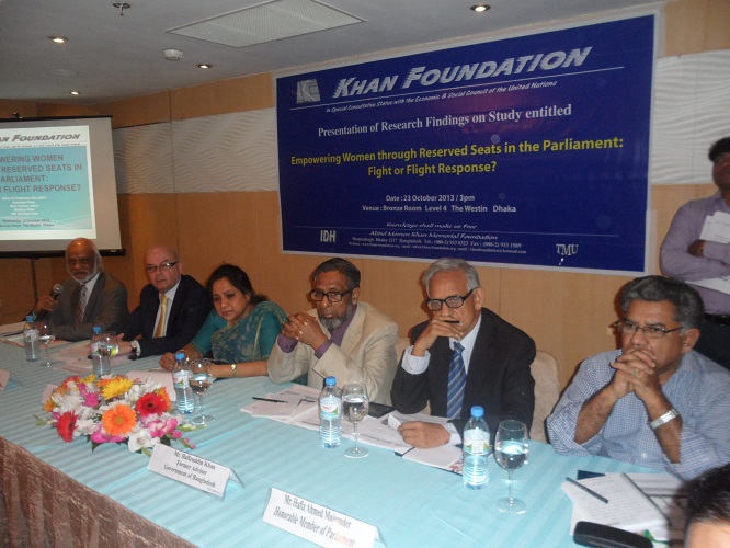 Sharing Meeting on Empowering Women through Reserved Seats in the Parliament: Fight or Flight Response?![]() Khan Foundation (KF) has been working on an extensive nationwide research program focused on womens empowerment in the political domain and arranged a seminar focusing on the findings of a forthcoming research paper entitled, \'Empowering Women through Reserved Seats in the Parliament: Fight or Flight Response?\' from 3.00 pm to 5.00 pm on Wednesday the 23rd of October 2013 at The Westin, Dhaka. Khan Foundation is working on the political empowerment of women since its inception in 1988 through various approaches includes hands on in-house and outreach training programs to enable women to become instrumental as well as integral in the decision making process in the national and local level policy formulation. Consequently, khan Foundation felt the need to address the long-standing debate on the impact of reserved seats in the Parliament in promoting womens empowerment in the political arena by undertaking an in-depth research to provide some concrete and pragmatic arguments for and against the concept of empowerment through exclusion. The study is focused on determining whether reserve seats serve as a channel in elevating the role of women in politics, or, on the contrary, work as an impediment to gender equality leading to exclusion in the political sphere. In light of the upcoming general elections, the timing for presenting the findings of such a study seemed relevant and consequently Khan Foundation was keen to put forth our recommendations based on the study for everyone to review. Robert Gibson, High Commissioner of United Kingdom; Mr. Lee Yun Young, Ambassador of Republic of Korea in Bangladesh; Hafiz Uddin Mojumder, Honorable Minister of Parliament; Dr. Abdul Moyeen Khan, Former Minister of Government of Bangladesh; Advocate Rokhsana Khondker, Executive Director of Khan Foundation; Shakhawat Hossain, Former Chief Election Commissioner were present in the seminar. The civil society representatives, academicians, foreign delegates and representatives of specified sectors were also present in the seminar. Advocate Rokhsana Khondker presented the main paper of the study. After the presentation the floor has been opened to all for discussion. The guests and the speakers of the seminar generated their recommendation regarding the study. Most of the speakers argued for direct election for women representatives and emphasized on more party nomination for women. The idea came out from the seminar that, women are playing ornamental role in the parliament till now which is not accelerating women political empowerment rather obstructing this. Former organizing secretary of Awami League Mr. M Manna said that the Reserved Seat is working behind the women empowerment. He also provided his opinion that women are not strong enough politically to fight against men till now. Argument stands against his opinion that Reserved Seat is not helping women to be empowered politically. Executive Director of Democracy Watch, Ms. Taleye Rehman argued women are strong and capable as parallel as men and women eligible to keep state with men if they get equal opportunities. Mr. Hafiz Uddin Mojumder, Honerable Memember of Parliament said that6 women are empowering gradually. He emphasized on direct election for bringing women to electoral politics as introduced in local level political structure. Shama Obayed supposed that political parties can play the pivotal role to make women politically empowered. Dr. Najmunnesa Mahtab agreed with Shama Obayed. Nelofar Chowdhury Moni (MP) said that women are politically empowering gradually but it will be ensured when the male dominated society will changed with views. Ranjan Kramaker from STEPS and Munira Khan from FEMA suggested for 100 Reserved Seat. Ranjan Karmaker emphasized on direct election ion Reserved Seat while Muniar Khan argued reversely. Jerin Khan (former women MP) shared her practical experience with the participants. Jerin Khan and other women representatives strongly claimed for constitutional power practice for them. The British High Commissioner Robert Gibson said that United Kingdom is working for women development globally. He also said that women empowerment can ensure democracy. Gibson invited political parties to come forward in this issue. The Executive Director of Khan Foundation Rokhsana Khondkar recommended that political parties should give more nomination to women in general seat in a considerable rate comparing to male. |